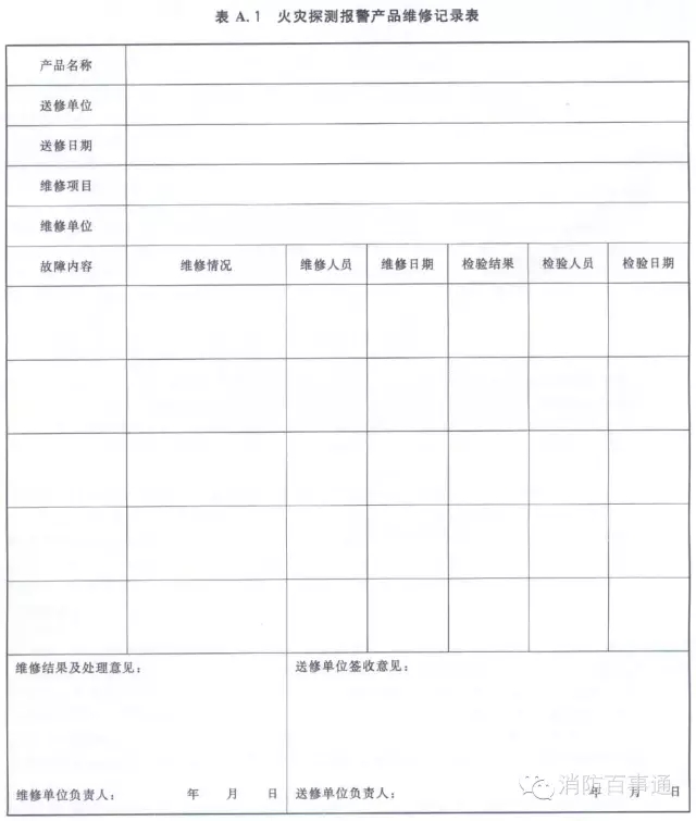 3.1.6承擔(dān)維修的企業(yè)應(yīng)做好維修記錄,與產(chǎn)品使用或管理單位各執(zhí)一份,并保存至該產(chǎn)品報(bào)廢。火災(zāi)探測報(bào)警產(chǎn)品維修記錄表的格式參見附錄A。